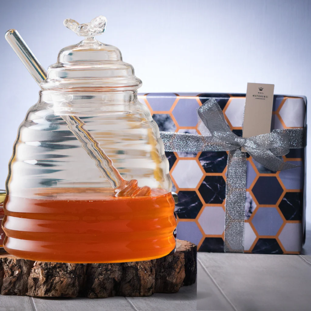 This beautiful Borosilicate glass honey jar is the perfect addition to any kitchen and an ideal way to store honey, with its exceptional design and finish it comes with its own glass honey dipper for ease of use and drizzle.