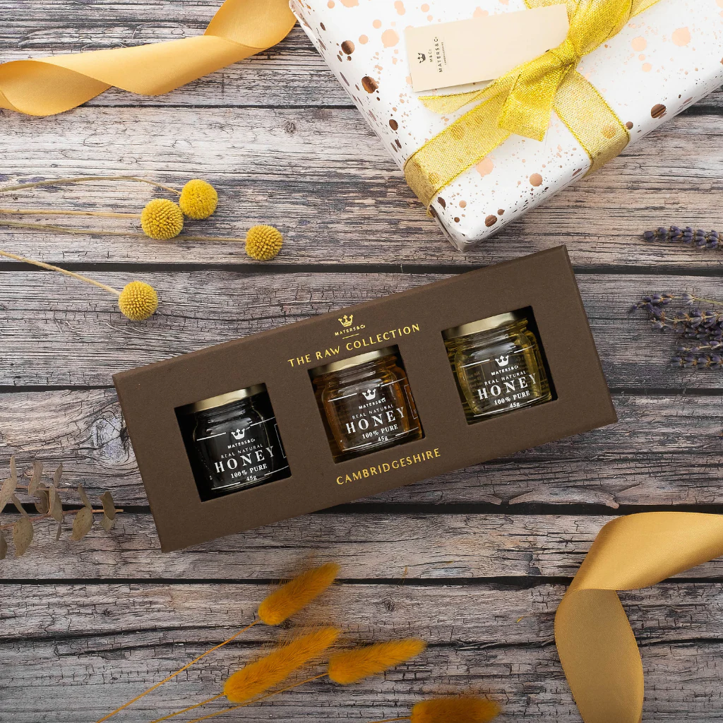 Stunningly presented in a brown bespoke hinged gift box with gold detailing, three beautifully elegant jars of award-winning honey shine through.